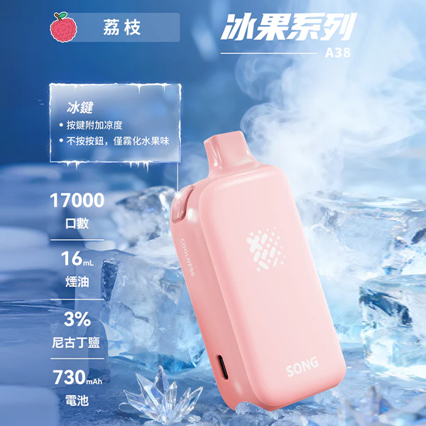 正品崧冰砖SONG A38冰果系列一键冰爽功能17000口一次性电子烟-荔枝味