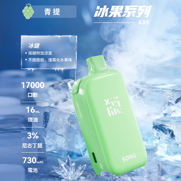 正品崧冰砖SONG A38冰果系列一键冰爽功能17000口一次性电子烟-青提味